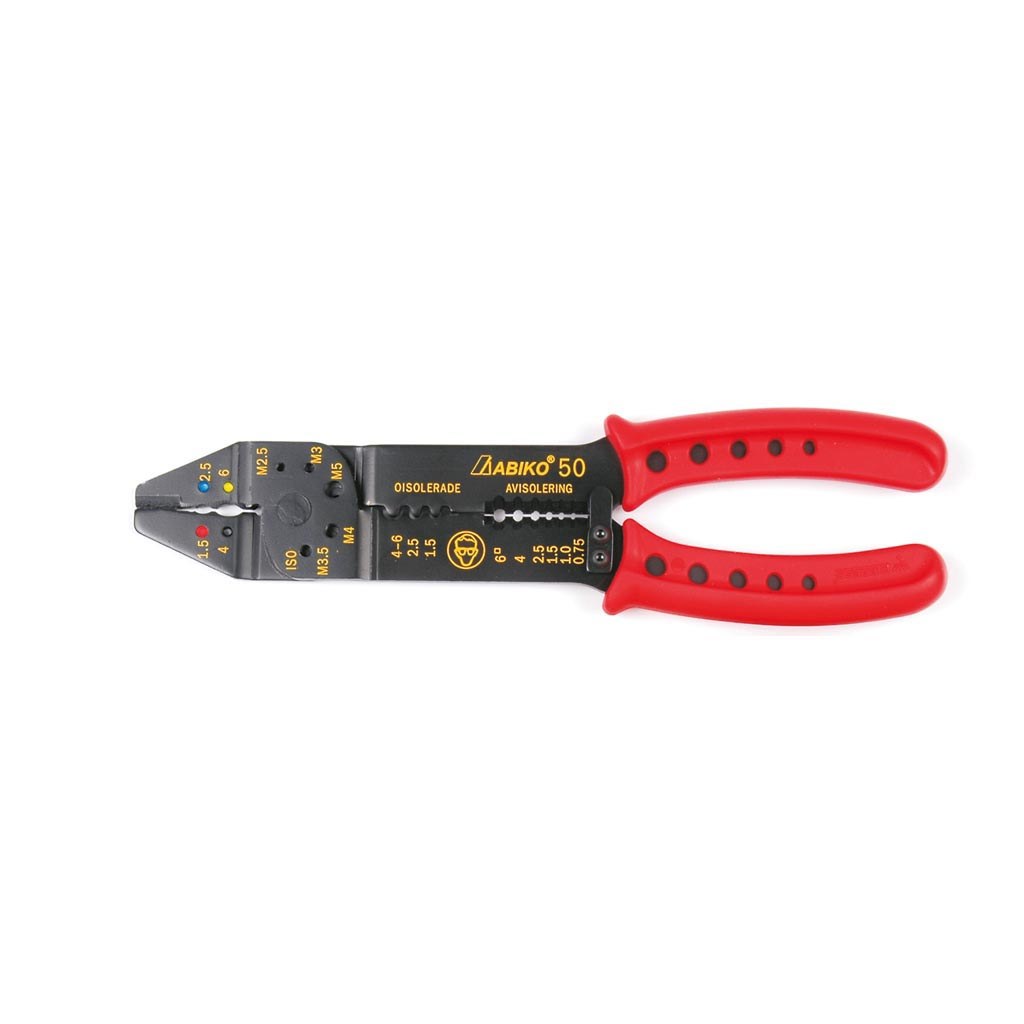 ABIKO Kuorinta-liitinpihti. No. 50 punainen. 0,5-6 mm2 eristetyille ja 1,5-6 mm2 eristämättömille liittimille.