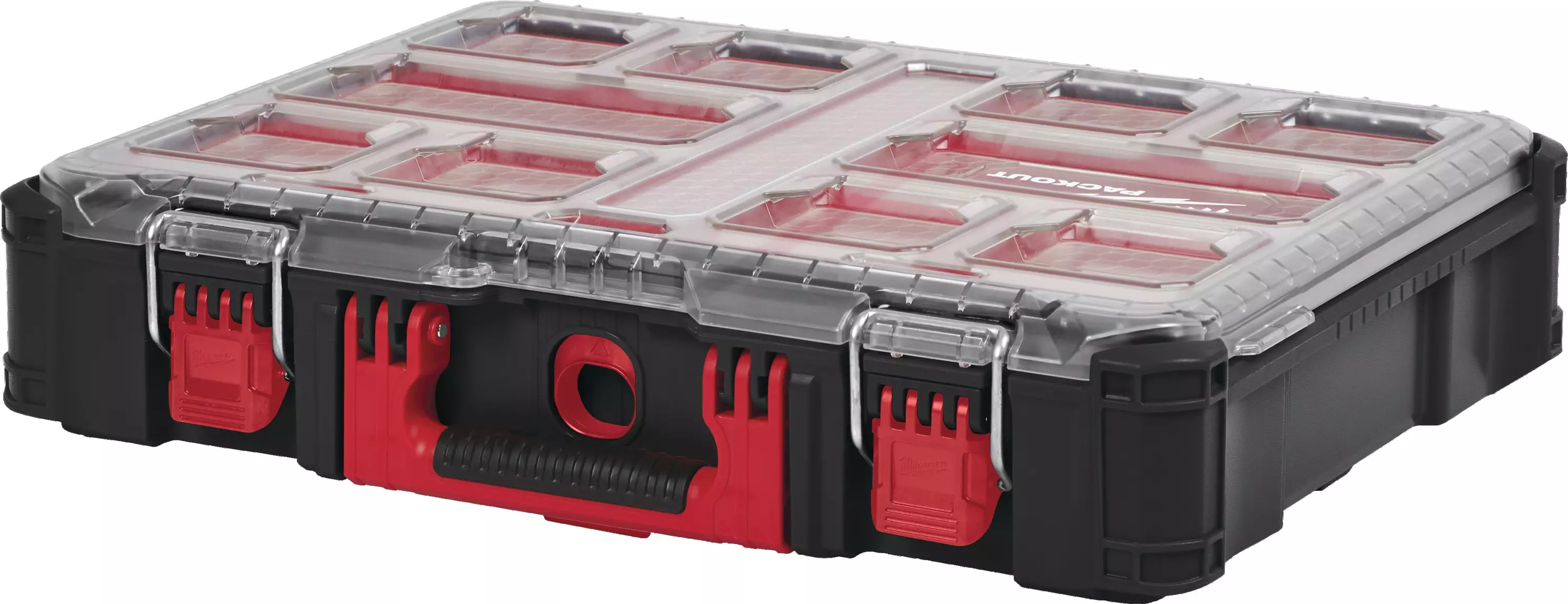 Milwaukee Packout lokerikko. Valmistettu iskunkestävästä polymeerista. Sisältää 10 irrotettavaa ja asennettavaa lokerikkoa, jotka voidaan kiinnittää yleisimpiin työmaamateriaaleihin. Paikallaan pysyvät tiivisteet estävät laatikoiden sisällön siirtymisen lokerikoiden välillä kuljetuksen aikana. IP65-luokittelu. Mitat: 500 x 380 x 120 mm.