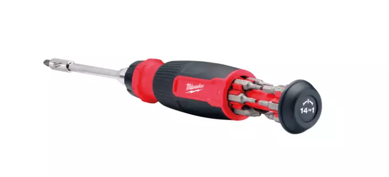 Milwaukee 14-in-1 vaihtokärkimeisseli räikällä. Kärkisäilytys kahvassa helpottaa ja nopeuttaa kärkien käyttöönottoa. Puuttuvat kärjet on helppo huomata. Kärkisäilytys voidaan poistaa, jolloin kärjen kanssa pääsee helposti ahtaisiinkin työtiloihin. Kärjet voidaan yhdistää suoraan työkaluun 1/4" liitännän avulla. Laserkaiverretut kokomerkinnät kahvan päässä helpottavat tunnistusta.