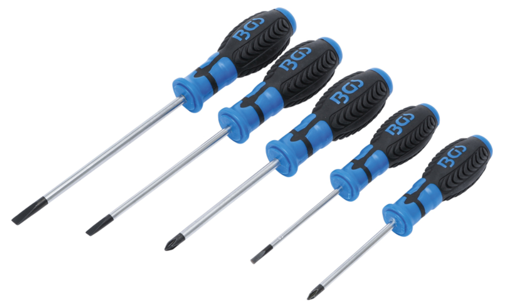 BGS ruuvitaltta sarja 5-osainen. Ruuvitaltta ristipää: PH1x80 mm - PH2x100 mm. Ruuvitaltta tasapää: 4,0x80 mm - 5,5x125 mm - 6,5x150 mm.