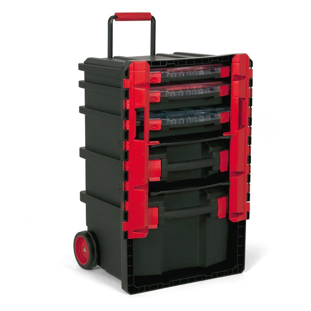 TAYG Vedettävä työkaluvaunu, Nro 59. 5-osainen vedettävä työkalupakki kahdella pyörällä ja teleskooppivetokahvalla, iskun ja pakkasen kestävää muovia. Lukittavissa riippulukolla. Sisältää lokerikot 430/50/50, 430/80/13, 430/80/0, sekä kaksi erikokoista työkalulaukkua. 500x410x770mm. Kantavuus 120 kg.