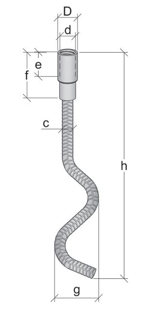 Käyräankkuri, pitkä. Soveltuu ohuiden kappaleiden, kuten seinä- ja parveke-elementtien nostamiseen ja kääntämiseen. Kuorma 1,2T. Koko d x h: Rd 16 x 216. D: 21,5 mm. c: 12 mm. e: 27 mm. f: 58 mm.