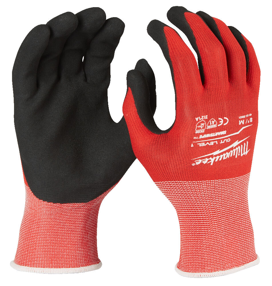 Milwaukee asentajan käsineet Cut A. Mukava ja näppärä käyttää koko päivän ajan. Vahvistetut nitriilikämmenosat. Näppärät myös pienten tarvikkeiden käsittelyyn. SmartSwipe mahdollistaa älylaitteiden kosketusnäytön käytön käsineet kädessä. EU-sertifioitu viiltosuojaus: EN ISO 21420 ja EN388:2016 (4121 A)
